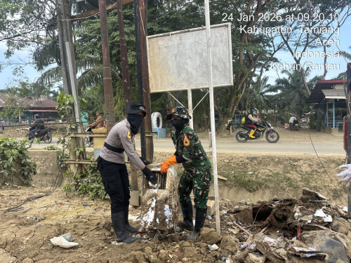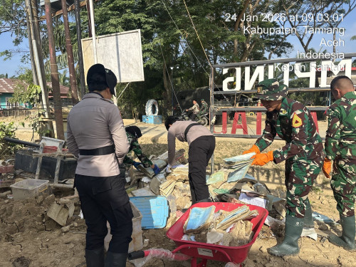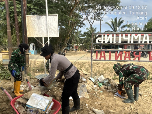 Subsatgas 1/Macan Satuan Tugas Taruna (Satgastar) Latsitarda Nusantara ke-46 melaksanakan kegiatan pembersihan di Kantor Desa Kebun Rantau, Kecamatan Rantau, Kabupaten Aceh Tamiang, sebagai bagian dari upaya pemulihan fasilitas pelayanan publik yang terdampak bencana alam.