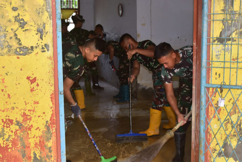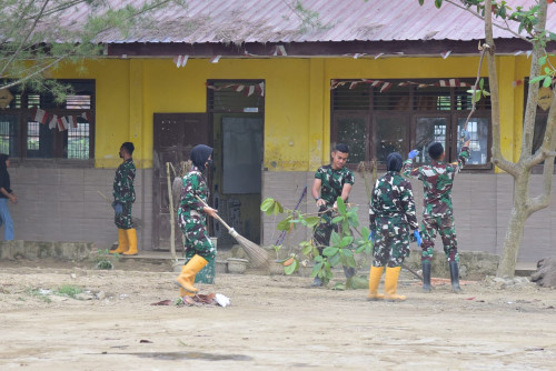 Taruna dan Kadet yang tergabung dalam Subsatgas 2/Hiu Satuan Tugas Taruna (Satgastar) Latsitarda Nusantara ke-46 kembali melaksanakan kegiatan pembersihan di SMP Negeri 1 Manyak Payed, Kabupaten Aceh Tamiang.