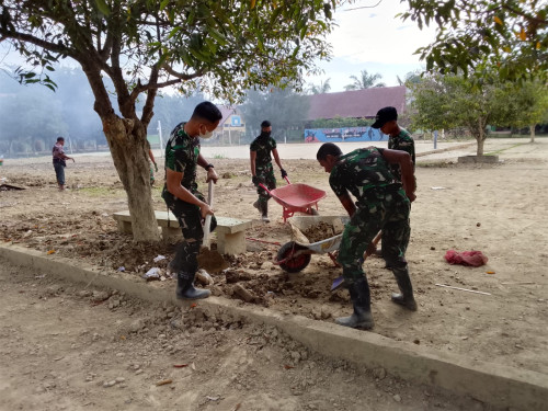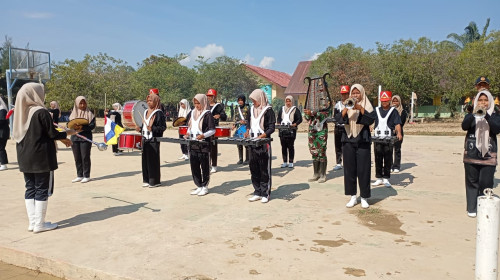Taruna dan Kadet yang tergabung dalam Subsatgas 2/Hiu Satuan Tugas Taruna (Satgastar) Latsitarda Nusantara ke-46 melaksanakan kegiatan pembersihan lingkungan sekolah dan kolaborasi penampilan drumband bersama siswa-siswi SMA Negeri 1 Manyak Payed, Kabupaten Aceh Tamiang.