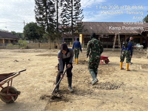 Subsatgas 1/Macan Latsitarda Nusantara ke-46 kembali melaksanakan kegiatan pembersihan di SD Negeri 1 Rantau Pauh, Kecamatan Rantau, Aceh Tamiang. Kegiatan difokuskan pada pembersihan sisa lumpur mengeras di halaman Kelas.