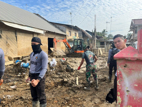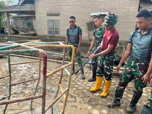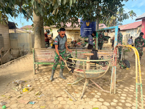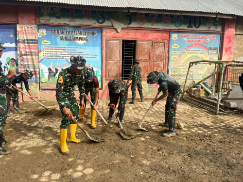 Subsatgas 4/Kijang Latsitarda Nusantara ke-46 kembali melaksanakan pembersihan di TK Pelangi Anak, Bukit tempurung, Kualasimpang, Aceh Tamiang. Kegiatan pembersihan di fokuskan ke sisa materil lumpur di halaman sekolah dan penyemprotan air