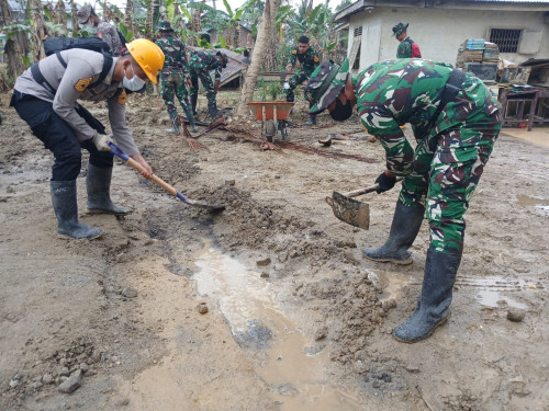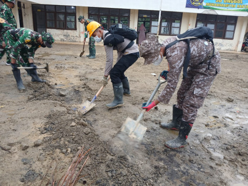 Kegiatan tersebut difokuskan pada pembersihan sisa materiil lumpur yang masih terdapat di area luar ruang kelas, sebagai dampak pascabencana banjir. Pembersihan dilakukan secara menyeluruh pada halaman sekolah, akses masuk kelas, serta lingkungan sekitar fasilitas pendidikan guna mendukung terciptanya kondisi belajar yang bersih, aman, dan nyaman bagi peserta didik.