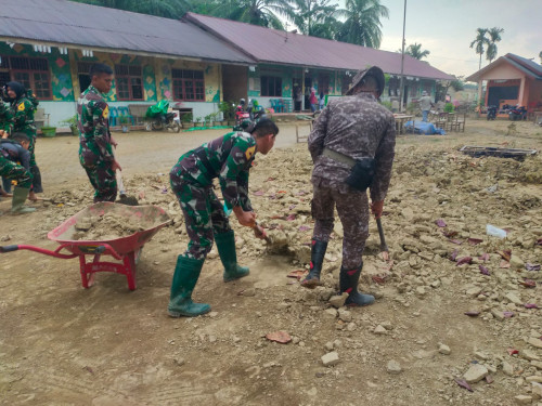Taruna dan Kadet yang tergabung dalam Satuan Tugas Taruna (Satgastar) Latihan Integrasi Taruna Wreda Nusantara (Latsitarda Nusantara) ke-46 melaksanakan kegiatan pembersihan di SD Negeri 2 Kampung Durian, Kecamatan Rantau, Kabupaten Aceh Tamiang.