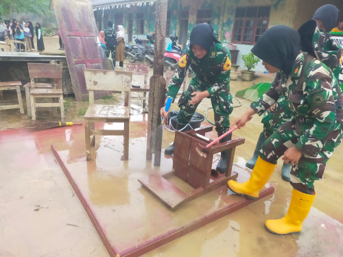 Kegiatan pembersihan difokuskan pada pengangkatan sisa materiil lumpur yang masih terdapat di area luar ruang kelas, serta pembersihan sarana belajar berupa meja dan kursi yang terdampak pascabencana banjir. Seluruh rangkaian kegiatan dilaksanakan secara sistematis dan bergotong royong guna memulihkan kebersihan serta fungsi fasilitas pendidikan.