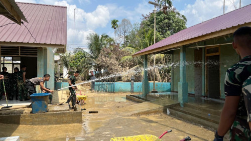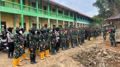 Taruna dan Kadet yang tergabung dalam Satuan Tugas Taruna (Satgastar) Latihan Integrasi Taruna Wreda Nusantara (Latsitarda Nusantara) ke-46 melaksanakan kegiatan pembersihan lingkungan di SMA Negeri 1 Kejuruan Muda Rantau, Kabupaten Aceh Tamiang.