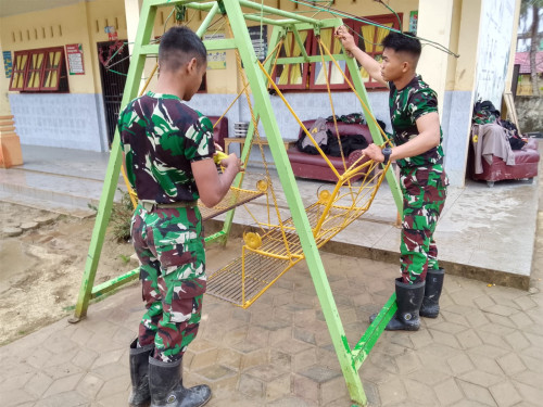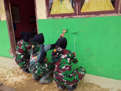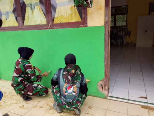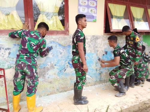 Taruna dan Kadet yang tergabung dalam Satuan Tugas Taruna (Satgastar) Latihan Integrasi Taruna Wreda Nusantara (Latsitarda Nusantara) ke-46 melaksanakan kegiatan pengecatan fasilitas pendidikan di TK Negeri Pembina Manyak Payed, Kabupaten Aceh Tamiang.