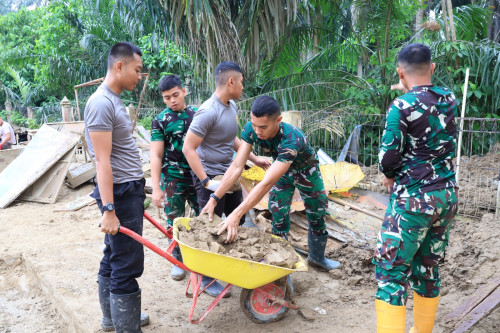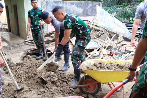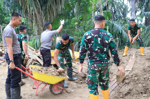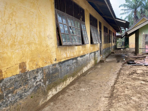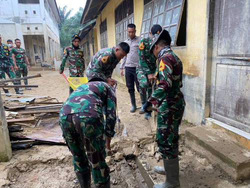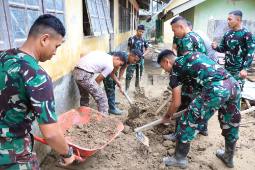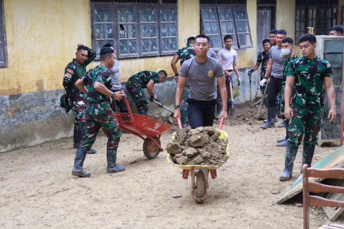 Kegiatan pembersihan difokuskan pada pengangkatan sisa lumpur yang telah mengeras di area luar sekolah sebagai bagian dari upaya pemulihan fasilitas pendidikan pascabencana. Taruna dan Kadet bekerja secara terpadu membersihkan lingkungan sekolah guna menciptakan kondisi yang bersih, aman, dan mendukung kelancaran proses belajar mengajar.