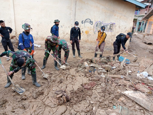 pembersihan di fokuskan pembersihan sisa lumpur mengeras yang menghalangi akses jalan meuju kota Kualasimpang