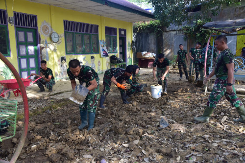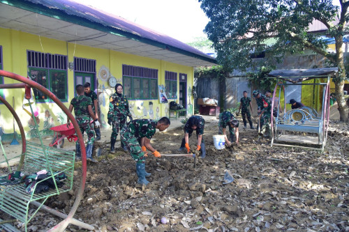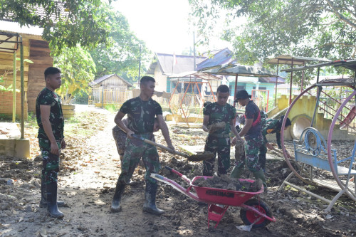 Subsatgas 2/Hiu Latsitarda Nusantara ke-46 melaksanakan kegiatan pembersihan di TK Al-Ahnat, Kecamatan Manyak Payed, Kabupaten Aceh Tamiang. Kegiatan ini dilakukan di lokasi fasilitas pendidikan yang terdampak bencana alam sebagai bentuk kepedulian dan pengabdian kepada masyarakat.
