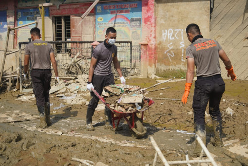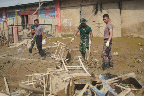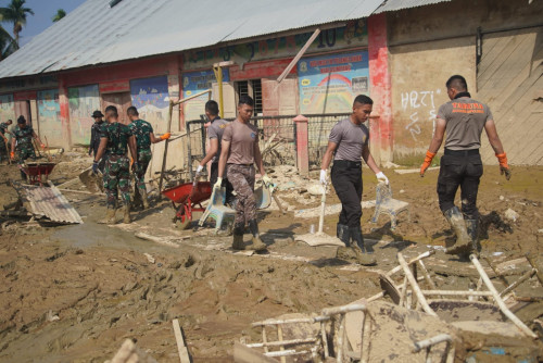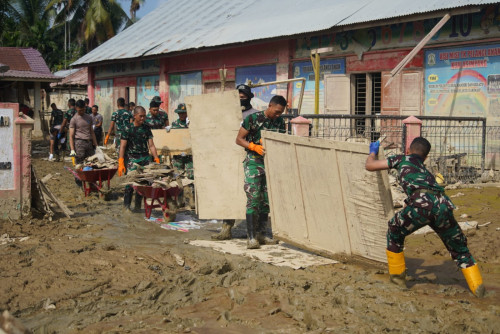 Subsatgas 4/Kijang Latsitarda Nusantara ke-46 melaksanakan kegiatan pembersihan di TK Pelangi Bukit Tempurung, Kecamatan Kuala Simpang, Kabupaten Aceh Tamiang, Sabtu (24/1/2026). Kegiatan ini dilakukan di lokasi sekolah yang terdampak bencana alam sebagai bentuk kepedulian dan pengabdian kepada masyarakat.