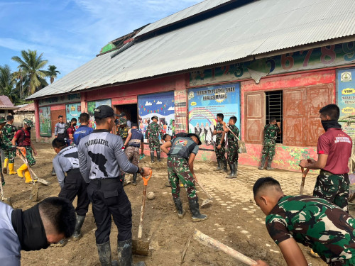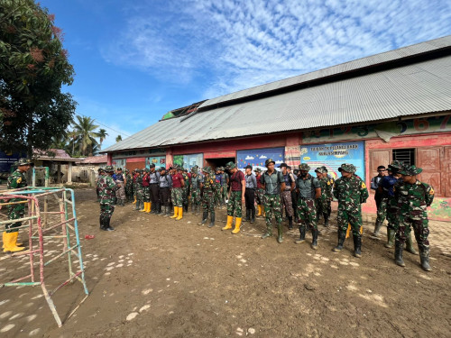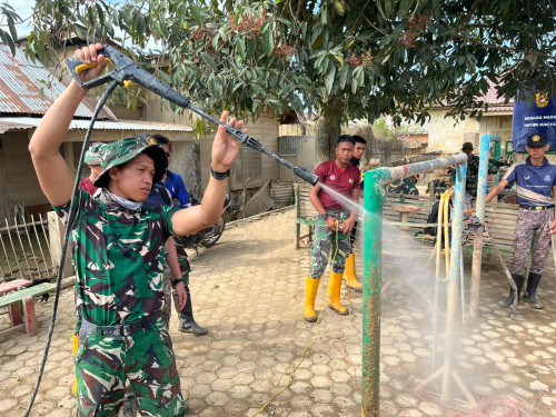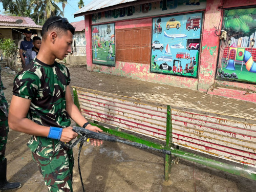 Subsatgas 4/Kijang Latsitarda Nusantara ke-46 kembali melaksanakan pembersihan di TK Pelangi Anak, Bukit tempurung, Kualasimpang, Aceh Tamiang. Kegiatan pembersihan di fokuskan ke sisa materil lumpur di halaman sekolah dan penyemprotan air