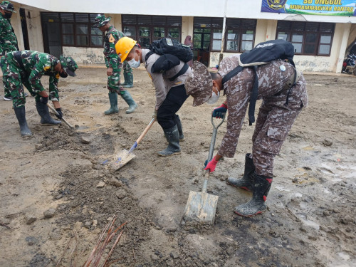 Taruna dan Kadet yang tergabung dalam Satuan Tugas Taruna (Satgastar) Latihan Integrasi Taruna Wreda Nusantara (Latsitarda Nusantara) ke-46 melaksanakan kegiatan pembersihan di SD Unggul Muhammadiyah Rantau, Kabupaten Aceh Tamiang.