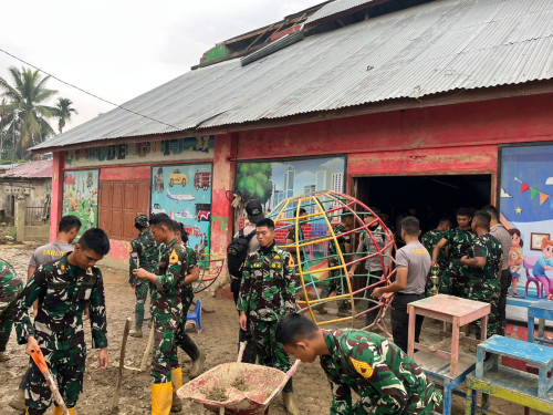 Taruna dan Kadet yang tergabung dalam Satuan Tugas Taruna (Satgastar) Latihan Integrasi Taruna Wreda Nusantara (Latsitarda Nusantara) ke-46 melaksanakan kegiatan pembersihan fasilitas pendidikan di TK Pelangi Anak yang berlokasi di Jalan Rantau, Kabupaten Aceh Tamiang.