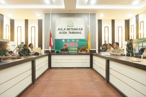 kunjungan kerja di Kabupaten Aceh Tamiang. Rapat berlangsung di Posko Terpadu
